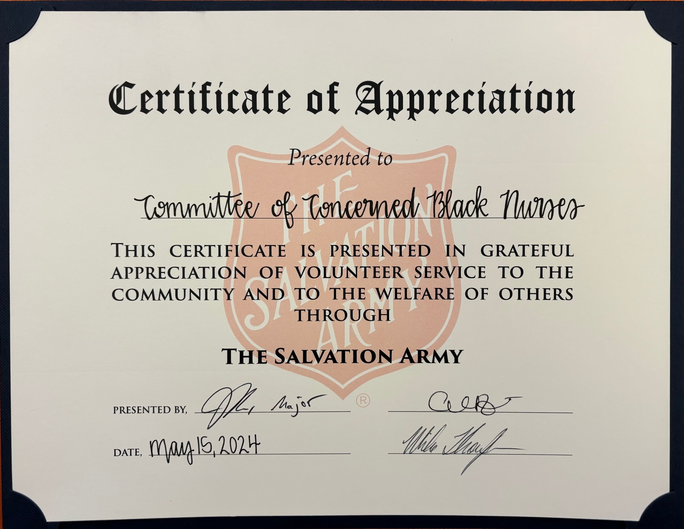 The Concerned National Black Nurses of the CSRA has always been a friend of the Salvation Army, contributing hours to ringing the Red Kettle bell during the holiday season and working in the Thrift Store. We are proud to give back and to help them “do the most good”.